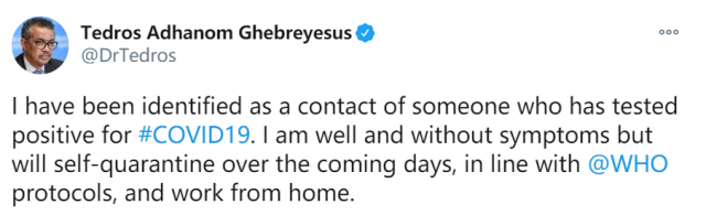 当地时间11月1日晚,谭德塞在个人社交媒体上表示,自己确认曾接触新冠病毒检测阳性者,目前身体状况良好并无任何症状,将进行自我隔离,遵守世卫组织防疫规定,居家办公。